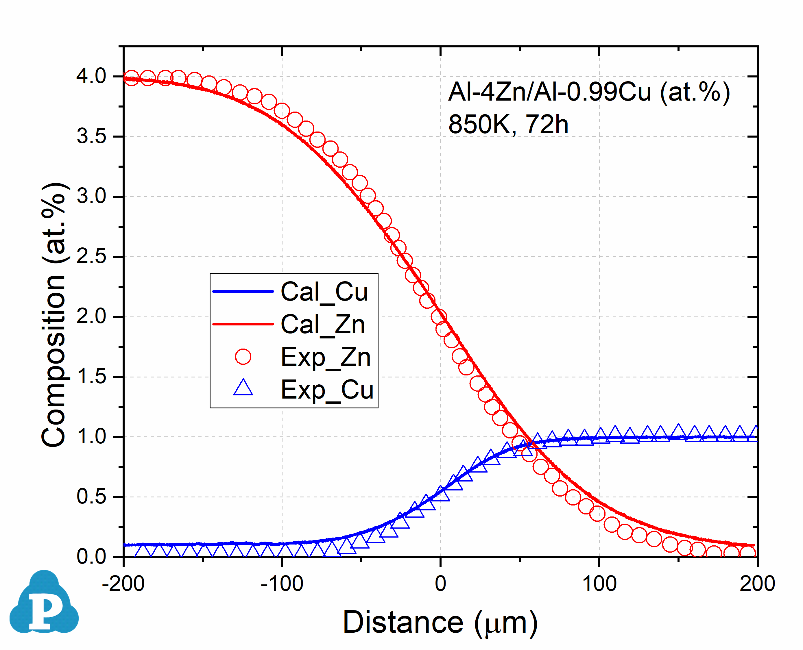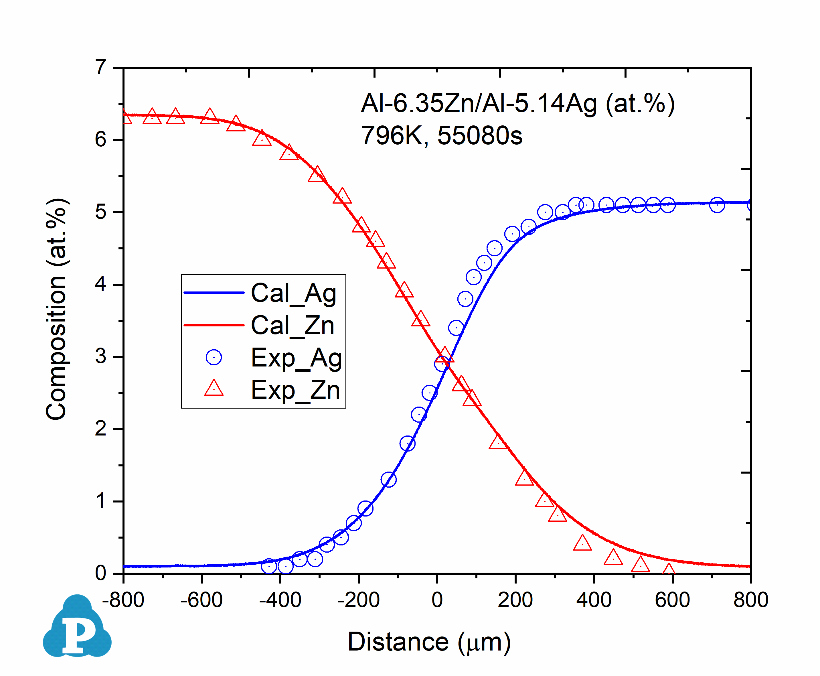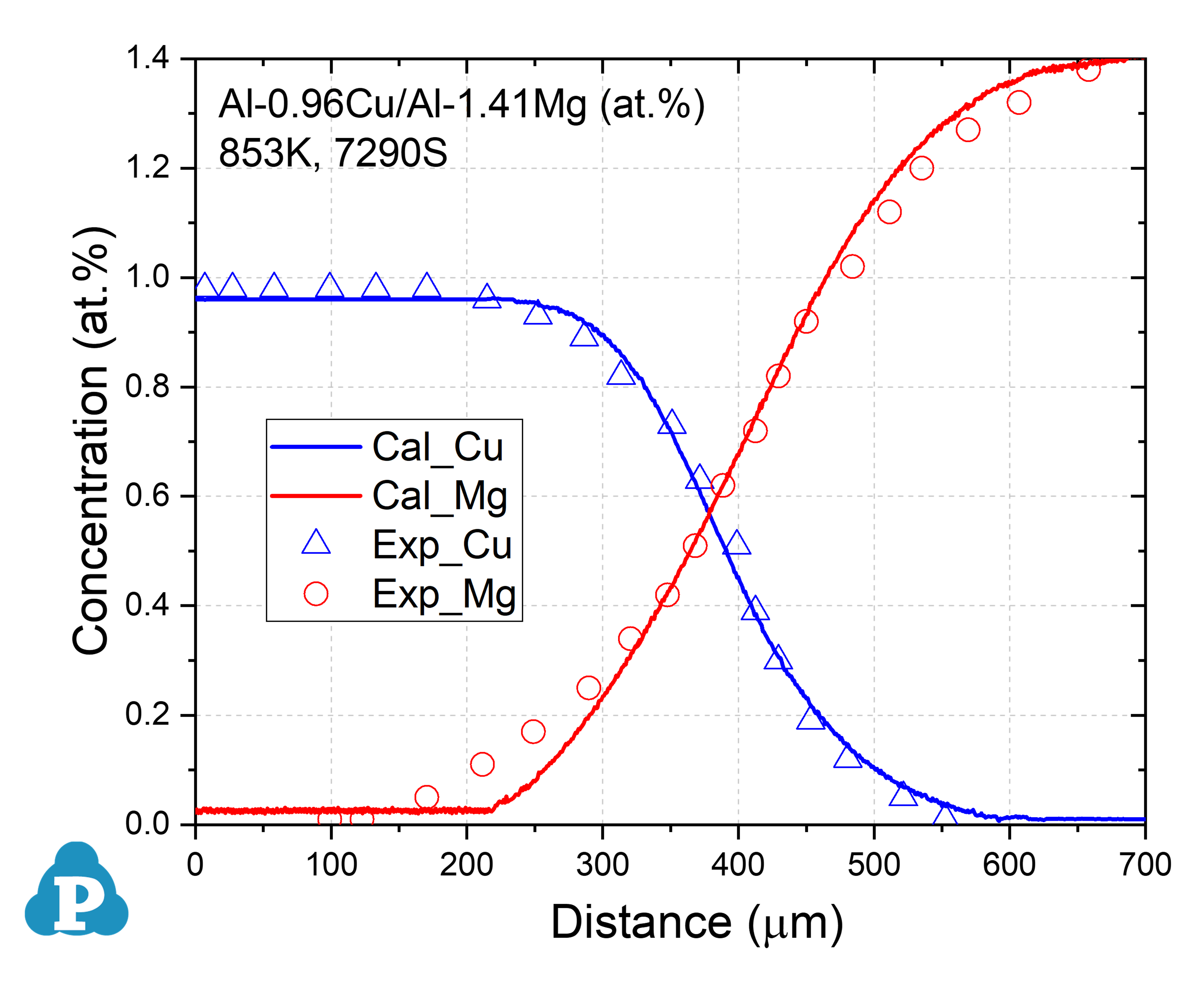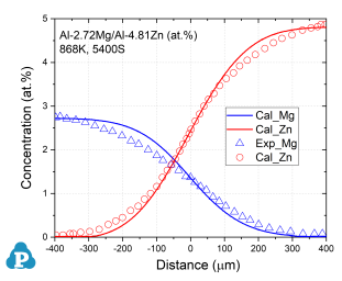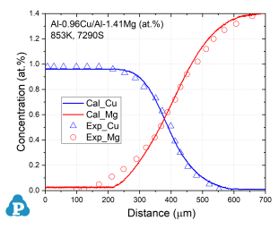 Figure 3: Concentration profiles of Al-0.96Cu/Al-1.41Mg (at.%) aged at 853K for 7290s [2010Zha, 2014Xin]