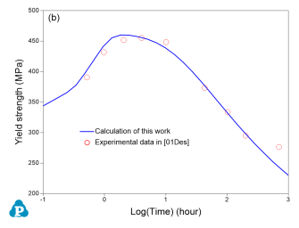 As is seen, the particles grow and coarsen with ageing time, while the yield strength reaches peak between 1 to 10 hours. The yield strength decreases quickly after 10 hours of ageing at 160 °C. The database used to do this simulation is the combined thermodynamic and mobility database of Al-based alloys: PanAl_TH+MB. More information regarding to precipitation simulation can be found in PanEvolution module under the Software section.