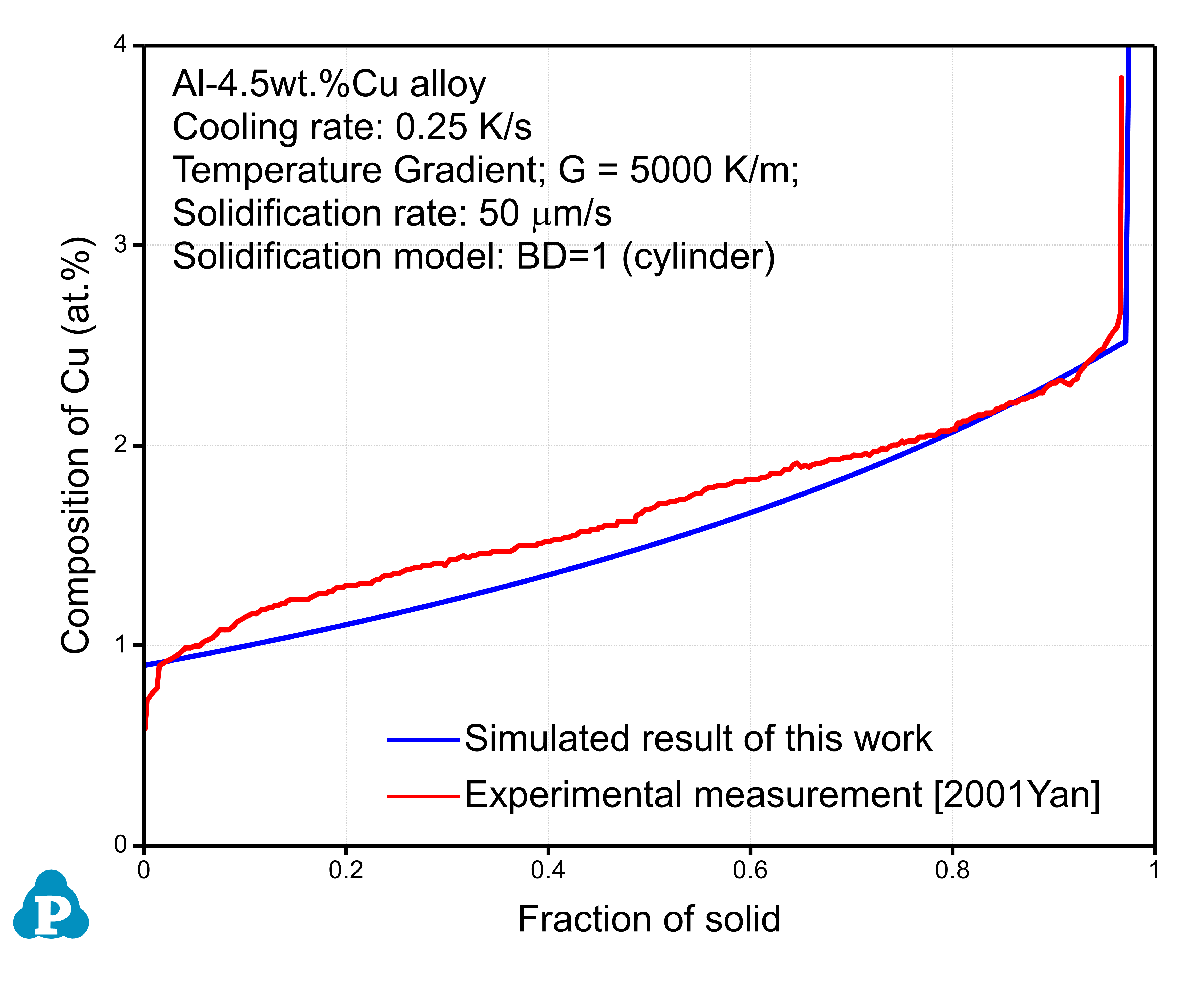 The PanSolidification module was developed for the simulation of solidification behavior of multi-component alloys considering the effects of back-diffusion in the solid matrix phase, cooling rate, and dendrite arm coarsening. As shown in Figure 7, the solidification of the Al-4.5wt.%Cu alloy at the cooling rate of 0.25K/s is simulated and compared with the experimentally determined data [2001Yan].