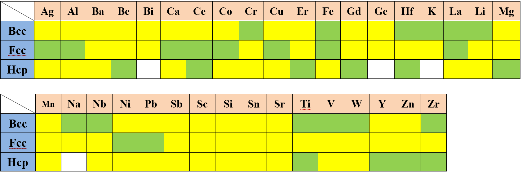 The self-diffusivity of an element is usually described by an analytical expression. For the stable crystal structures, these expressions can be obtained using the available experimental data, while those for the metastable/unstable states are usually estimated from those of the stable states. In the following tables, we use different color to represent different status: