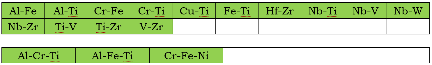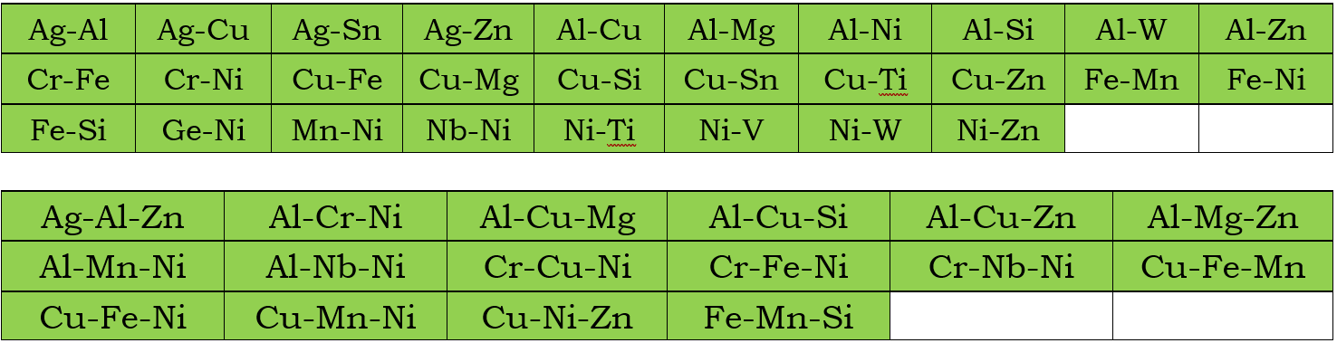 In addition to the assessed self-diffusivities shown above, the impurity diffusion data for all elements included in the current mobility database are also assessed. Moreover, chemical-diffusivities available in some binary and ternary systems are also used to assess the interaction parameters. These binary and ternary systems are listed below for the Bcc, Fcc, and Hcp phases, respectively.