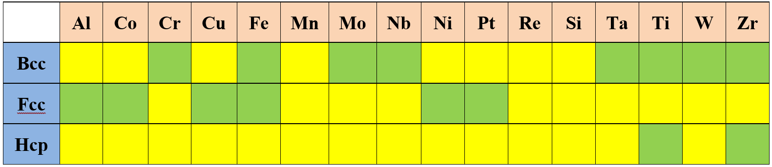 The self-diffusivity of an element is usually described by an analytical expression. For the stable crystal structures, these expressions can be obtained using the available experimental data, while those for the metastable/unstable states are usually estimated from those of the stable states. In the following tables, we use different color to represent different status:
