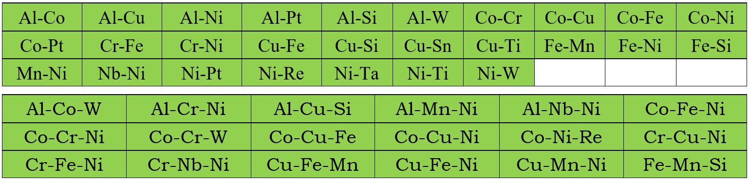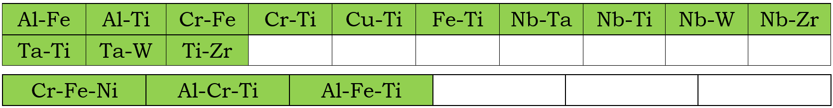 In addition to the assessed self-diffusivities shown above, the impurity diffusion data for all elements included in the current mobility database are also assessed. Moreover, chemical-diffusivities available in some binary and ternary systems are also used to assess the interaction parameters. These binary and ternary systems are listed below for the Bcc and Fcc phases, respectively.