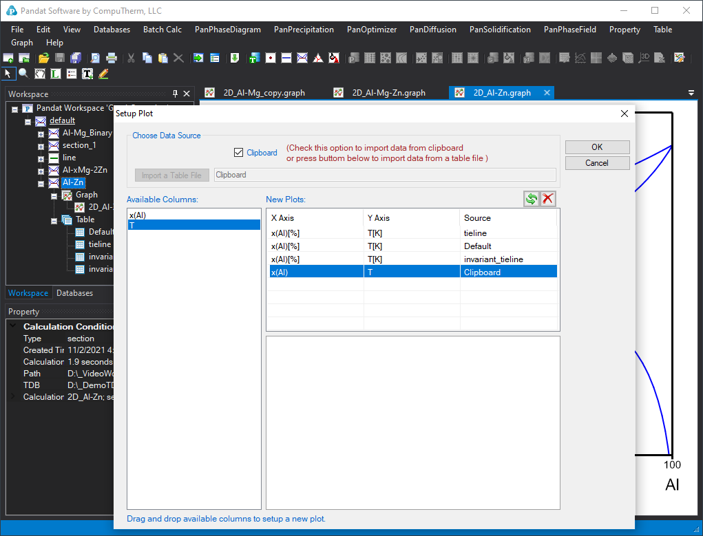 on the toolbar. On the popped-out “setup plot”dialog, check the clipboard, the property names from the excel file will be listed in the Window named as “available columns”. Select x(Al) and drag it into the field below the X Axis. Then select “T” and drag it into the field for Y axis. Then Click OK.