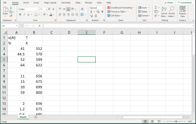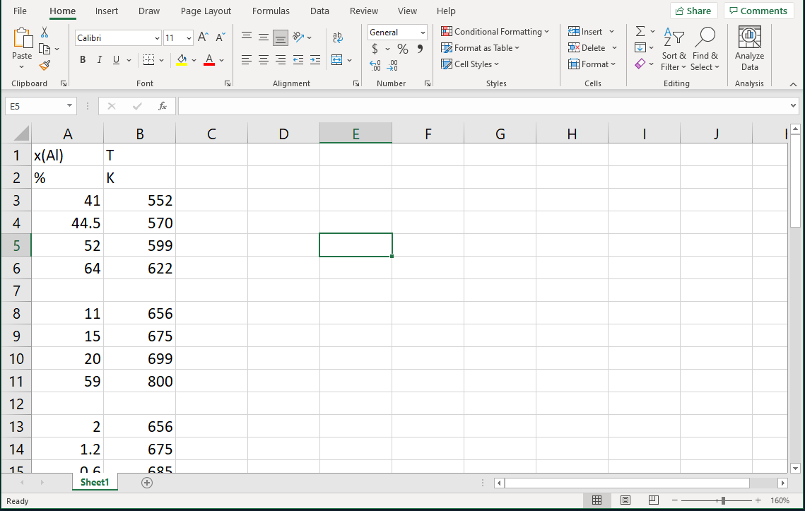 Step 1. Prepare your external data, either experimental data or calculated data from other software, in an excel file. Here we have experimental data of Al-Zn system as shown in Figure 1. The first row is reserved for property name, and the second row is for the unit of the property. The data start from the third row. Select the two columns of the experimental data and click copy.