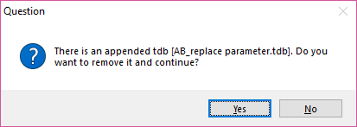 Note that, the Append TDB function allows user to append only one database to the original database. When user wants to append another database to the original database, the previously appended database will need to be removed first. Pandat will notify the user as shown in Figure 3.85 and user need to click Yes to confirm.