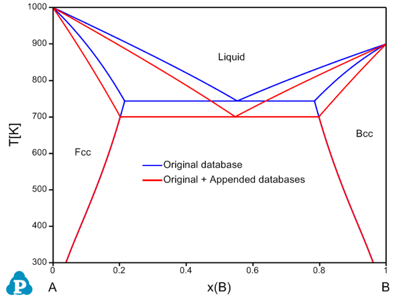 Figure 3.84 : Calculated A-B phase diagram using both original database and original + appended databases with adjusted parameters