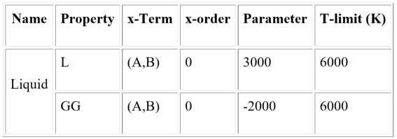 As shown in the above Section Replace the Value of an Existing Parameter, the original value of the G(Liquid,A,B;0) interaction parameter is +3000. When we append the AB_modify parameter.tdb to the original database, the value of -2000 will be added to the original value +3000 for the G(Liquid,A,B;0) interaction parameter. As shown in the TDB viewer below, one extra term “GG” is listed. For this case, the total value of the interaction parameter of G(Liquid,A,B;0) will be modified to be 3000 + (-2000) = +1000.