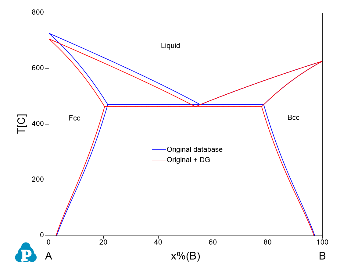 Figure 3.89: Calculated A-B phase diagram using both original database and original + appended databases with DG parameter