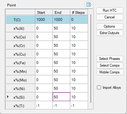 The composition setup dialog for the HTC function in different modules is the same. As shown in Figure 10.10 , the composition range of each component can be defined by using the Start and End values. The #steps define the number of calculations between the Start value and the End value. In this example, the composition of Ti is set as the balance by right-click the row of Ti, and all the values will be shown as “-1” as shown in Figure 10.10. Similarly, the temperature can also be set at constant temperature with #steps is 0, or change temperature by setting proper #steps value.