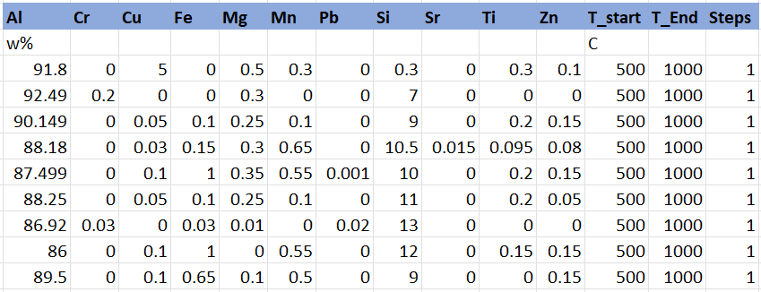 - The element in the first column is automatically treated as “balance” element, such as Al in this example. No matter what values are given in the first column, those values will be recalculated after the compositions of all other components are read in.
