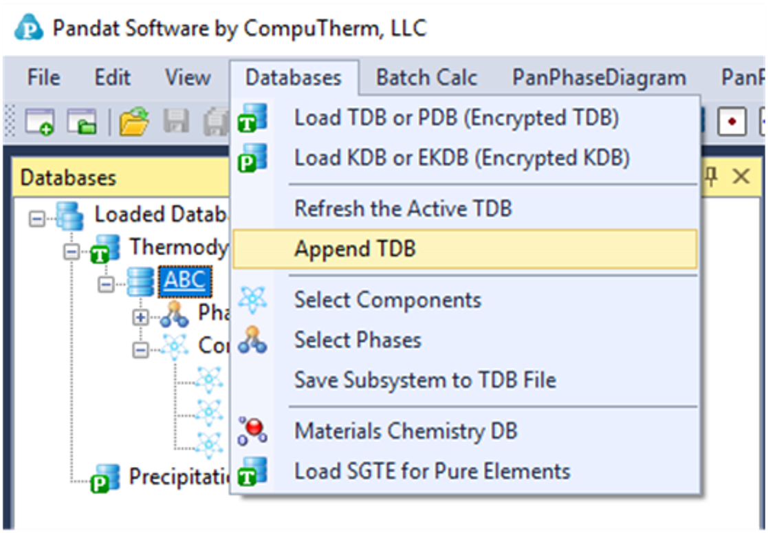 On top of the original database (*.tdb or *.pdb) loaded from Pandat GUI, users can append a customized database (*.tdb) by selecting the Append TDB function from the Databases menu as shown in Figure 3.82.