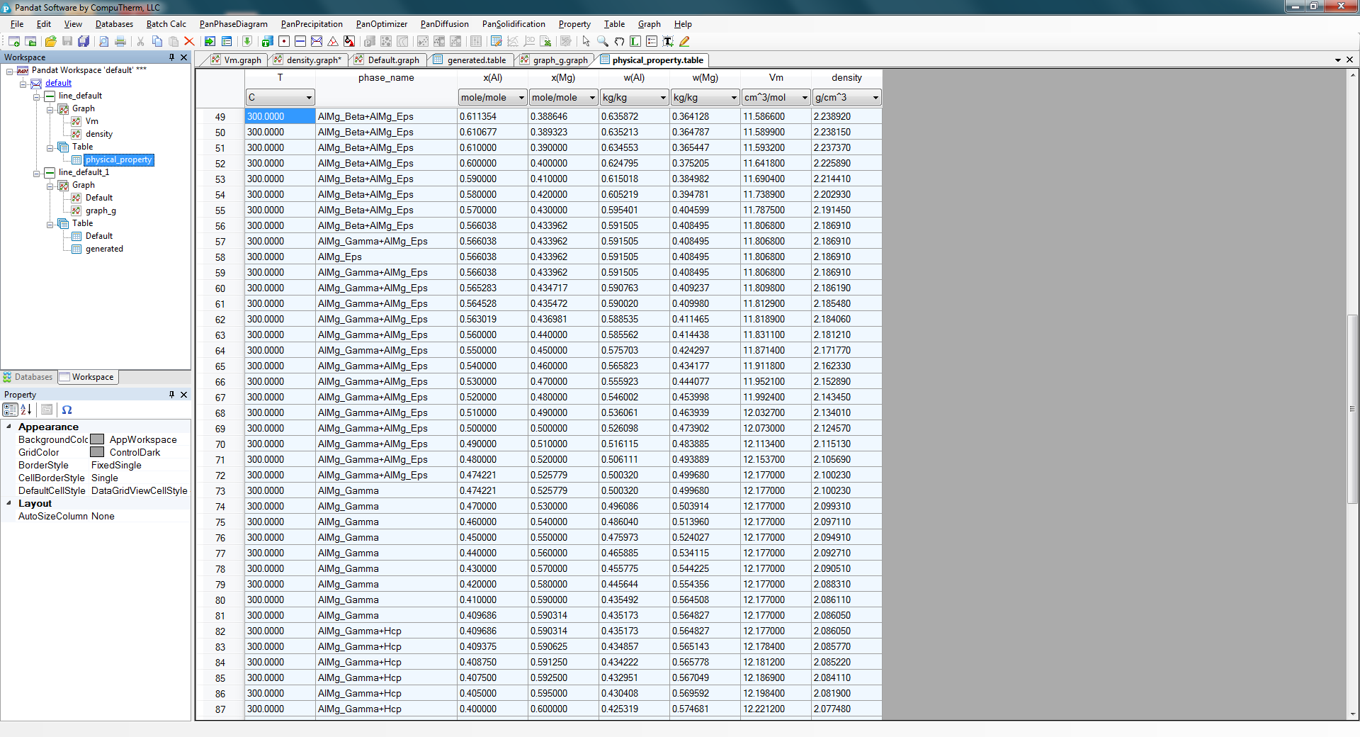Figure 1.12.5: The physical_property table showing the stable phases varying with the composition and the calculated molar volume and density