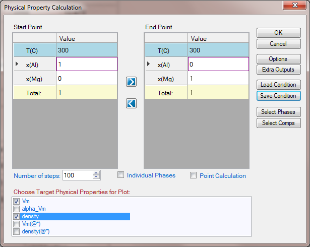 Figure 1.12.2: Setup calculation of molar volume and density from pure Al to pure Mg at 300 °C