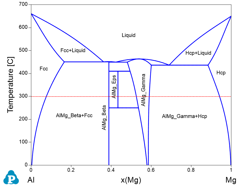 Figure 1.12.1 is the Al-Mg binary phase diagram. In this example, we learn to calculate the molar volume and density of the system as a function of x(Mg) at 300°C (the red dash line).