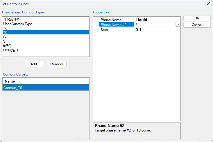 - The Contour Lines function is used to calculate the T0 curve, click the “Contour Lines” icon, the “Set Contour Lines” window pop up as shown in Figure 1.28.2. Add the T0 as the Contour Curves, select “Phase Name” as “Liquid”, and the “Phase Name #2” as “ * ”, Pandat will calculate the T0 curve between liquid and all solid solution phases. In this example, they are Fcc in Al side, and Hcp in Mg side .