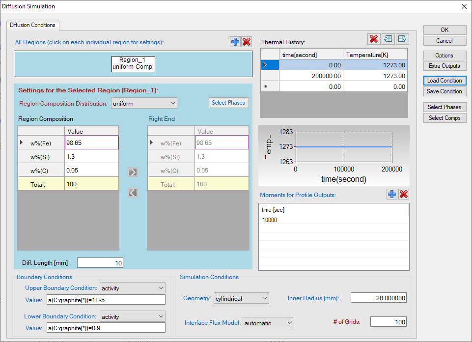 - Click on Region_1 and set the composition as 0.05C-98.65Fe-1.3Si (wt%), the Diff. Length as 10 mm, and the # of Grids as 200;