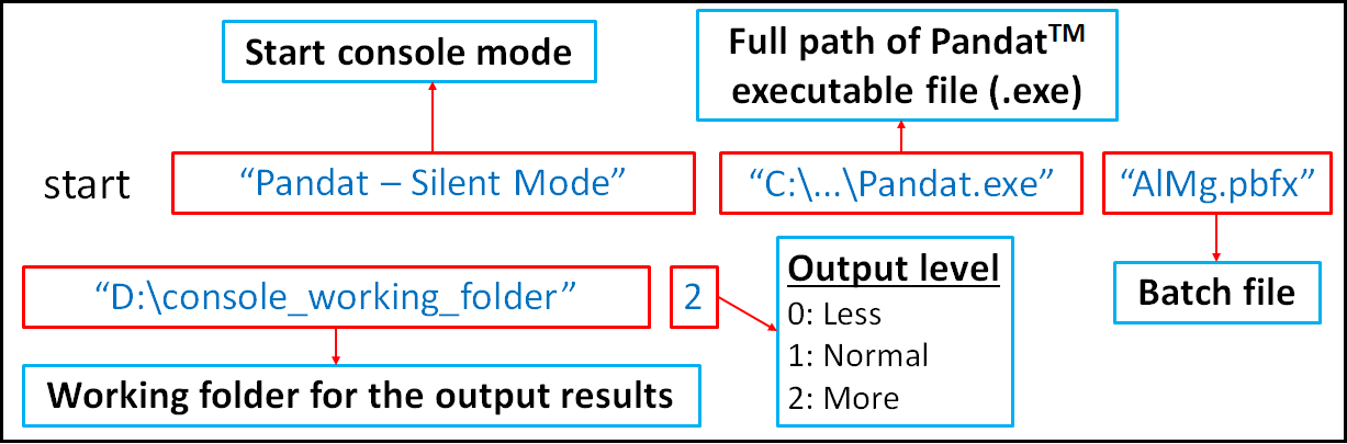The command is to start Pandat (with full path and titled as Pandat - Silent Mode) and run the batch file AlMg.pbfx (in the current folder if not in full path). The last two arguments are optional. If a working folder is given (D:\ \console_working_folder), a Pandat workspace is created in the folder and all simulation results are saved under the workspace. The simulation progress is logged in the file pandat.log. The last argument is to control the output level with “1” the default value. The value of “2” is for more outputs and “0” for less. Please refer to Run Pandat in Console Mode in the Pandat Example Book for more detail information.