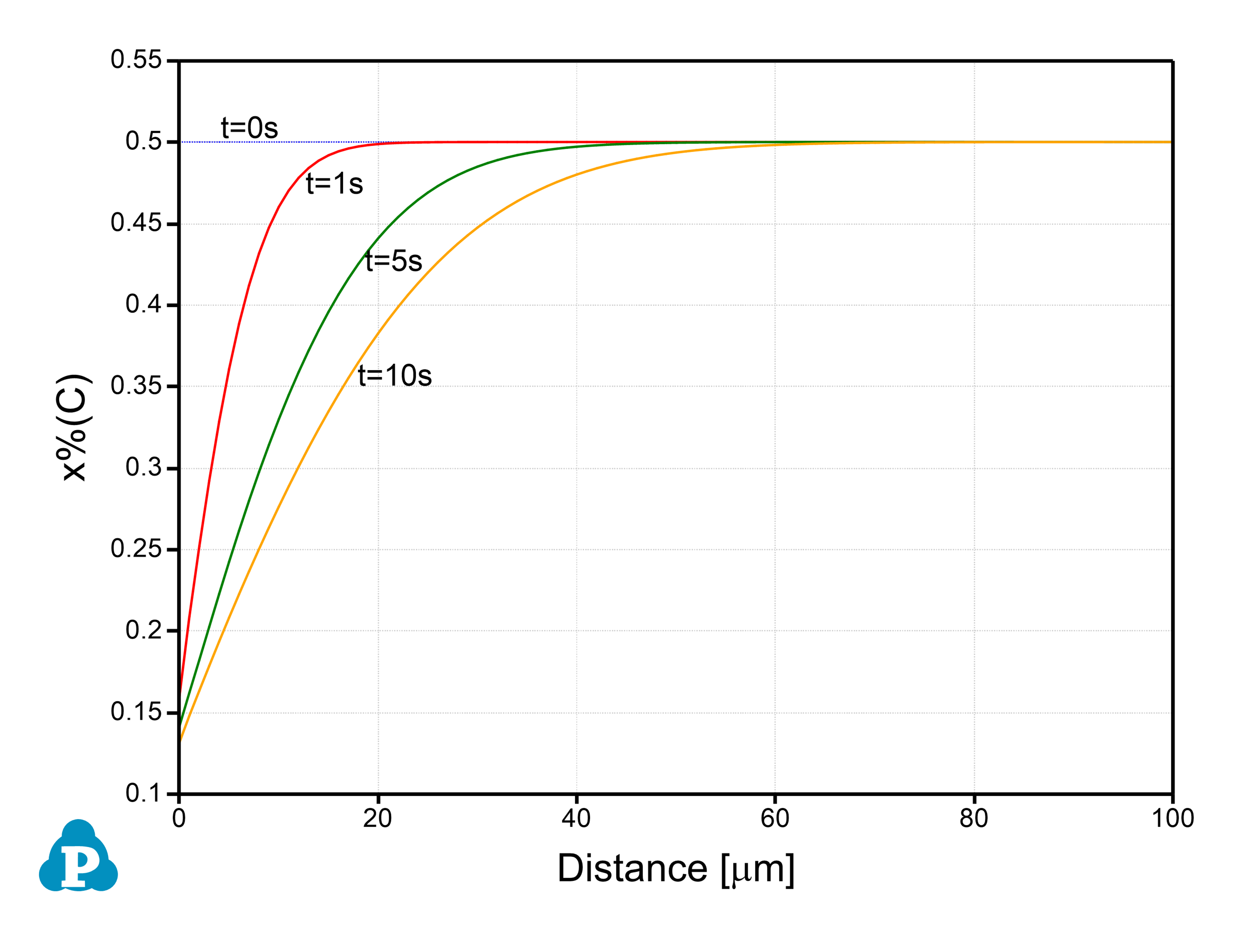 - By default, dissolution simulation gives time-evolution of particle size as output. In order to display composition profile at desired moments, click the blue “+” button next to the “Moments for Profile Outputs” and input a time value. As shown in Figure 4.14.1, profiles at 1 second and 5 second will be outputted. Click OK to start calculation;