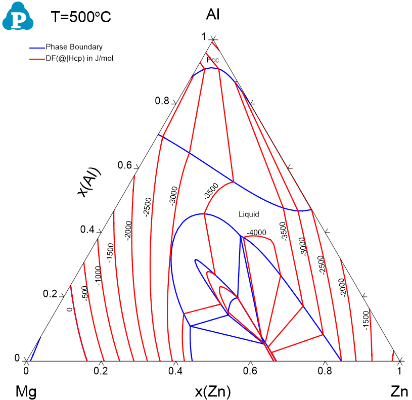 Contour diagram is also useful in viewing the stability of a phase comparing to the equilibrium state. The contour type is defined as DF(@|Hcp) as shown in Figure 3.49 (see Table 11.4 in Section Pandat Table Format Syntax for the definition of DF). Since Hcp phase may not be stable in all the phase regions in this isothermal section, in between “@” and “Hcp” a vertical bar symbol “|” is added to specify that the phase Hcp is in the “entered” status. Figure 3.50 shows the driving force contour lines of the Hcp phase in the Al-Mg-Zn system at 500°C. We see that Hcp phase has less driving force to be stable in the central region of the compositional triangle.