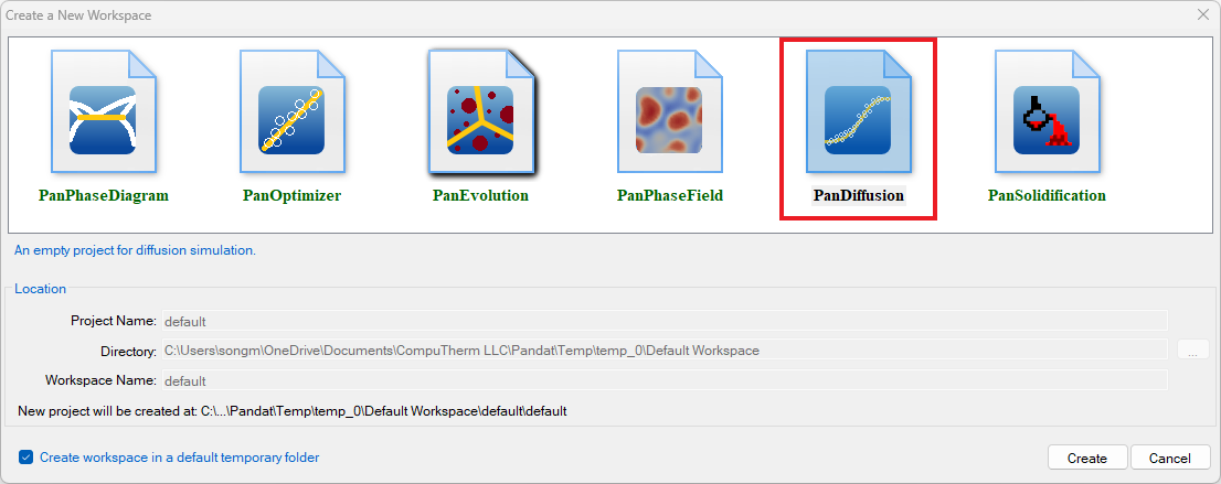 User can create a PanDiffusion project through menu “File → Create a New Workspace” or “File → Add a New Project” in an existing workspace. The “Module Window” pops out for user to choose a module for the new project as shown in Figure 6.3 . Choose “PanDiffusion” module for diffusion simulation, and the PanDiffusion project will be created after user click on Create button or double click on the PanDiffusion icon.