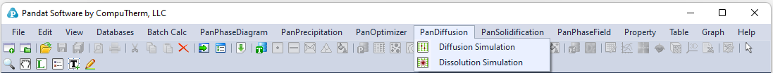 Perform diffusion simulation through the menu bar (Figure 6.4) or the tool bar icons (Figure 6.5). PanDiffusion deals with diffusion process in two strategies, General Diffusion Simulation and Particle Dissolution Simulation.