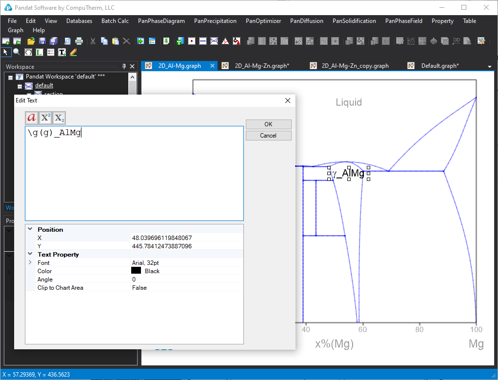 Step 2: Edit the label. Double click on the label, the text editor will appear, then you can also edit the context and properties of the label. For example, you can change the “AlMg_Gamma” used in the database to “γ_AlMg” phase by using the “\g(g)_AlMg” text. The syntax of \g(g) will show the Greek character of g as γ. Figure 2 shows the Al-Mg phase diagram after labeled the liquid and γ-MgAl phase.