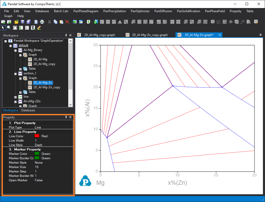 Step 2. Change the properties in the left side “Plot Property” window, where you can change the “Plot Type” as “Line, Point or LinePoint”. You can also change the “Line Property” and “Marker Property”. Figure 1 shows the tie line of the phase diagram with “line color” changed to “red” and “Line Style” to “Dash“.