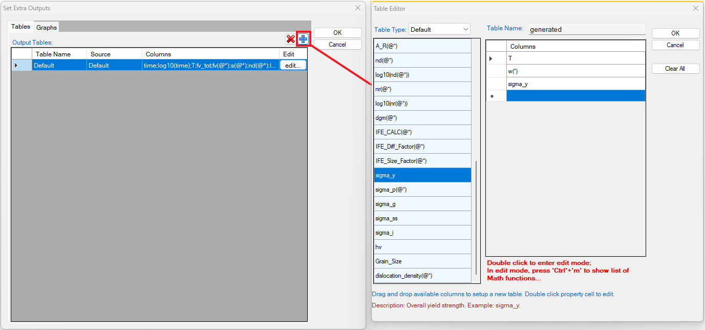 - In addition to use the default output, user can also customize the outputs using the “Extra Outputs” function shown in Figure 10.23 . Then another window (Figure 10.24) will pop-up for setting the extra outputs. In this example, the extra output with time, T - temperature, w(*) - alloy composition, and sigma_y (yield strength) is generated.