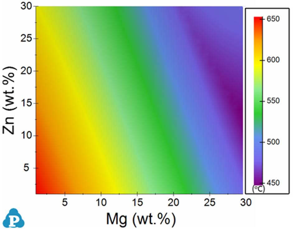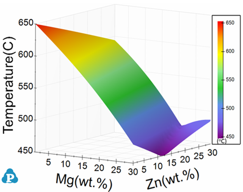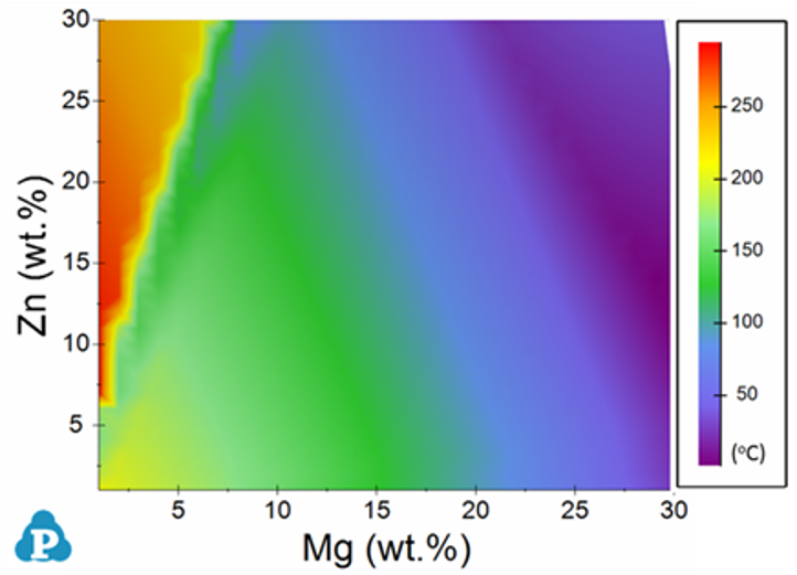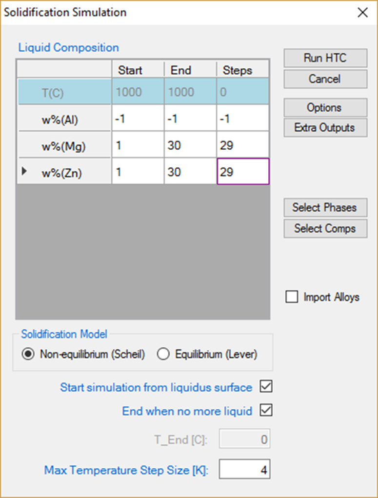 In this example, we will demonstrate how to calculate liquidus, solidus, and solidification ranges for a number of Al-Mg-Zn alloys via the HTC function by setting composition range and steps.