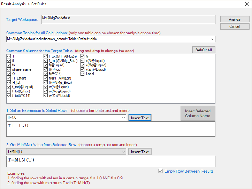 In Figure 10.17, the “Target Workspace” shows the workspace selected by the user for results analysis. It should point out that there can be more than one table in each calculation, the “Common Tables for All Calculations” allows user to choose the table for analysis. In the “Common Columns for the Target Table” window, names for all the output properties available in the selected table are listed. User can choose the properties to be listed in the “Analysis Report”. In this case. Since the purpose of HTC is to compare a special target property for the several hundred/thousands of calculations, the “Set an Expression to Select Rows” at the bottom of the window allows user to define the criteria. This criterion is fL=1, i.e., the fraction of liquid is 1. With this filter, only the row satisfies this criterion will be listed in the “Analysis Report”. It should point out that several criteria can be set in the “Set an Expression to Select Rows”.