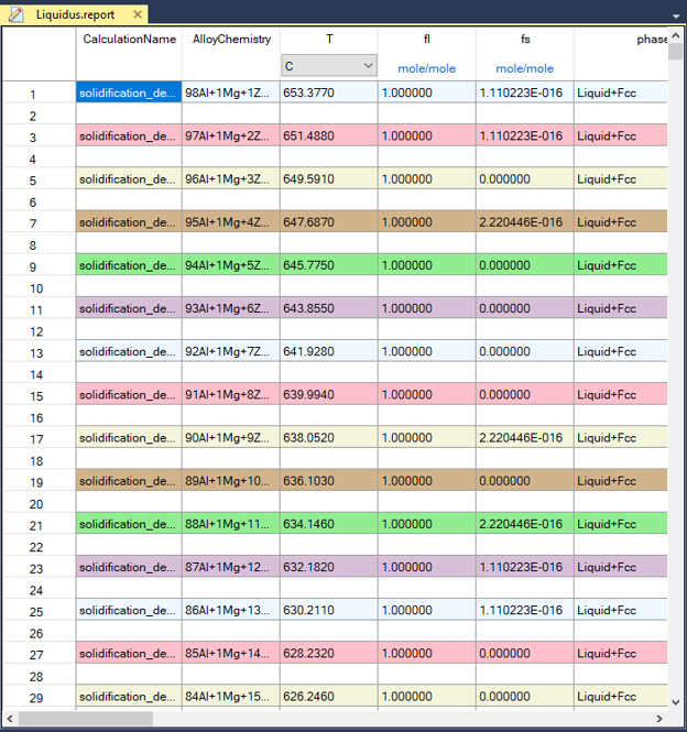 Click “Analyze” to create the “Analysis Report” as shown in Figure 10.18 In this table, each row lists the liquidus temperature (fL = 1) for the corresponding alloy composition. The liquidus temperatures for 900 alloys are listed in the same report which allows a quick comparison of liquidus temperature for different alloy composition. User can also plot 3D colormap and surface diagrams using the data in this report as shown in Figure 10.19 .