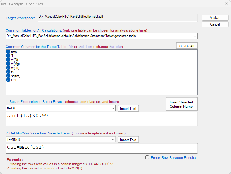 - Run “Result Analysis” from the “Batch Calc” menu. User can use this commend to analyze the calculated results for a group of alloys and pick a certain property from each calculation for comparison. As shown in the following Figure 10.30, the criterion is to output the CSI=MAX(CSI) point with the condition of sqrt(fs) < 0.99 at each composition point.