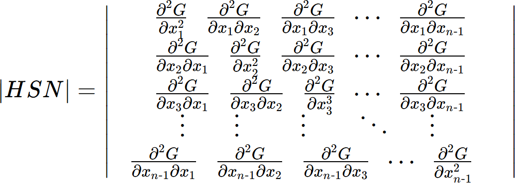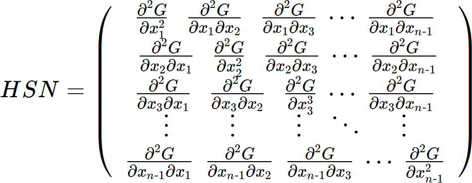 Since there is one dependent molar fraction for the molar fraction variables (x1,x2,⋯,xn), one of the components is selected as the dependent one. Without loss of generality, xn is selected as the one, i.e., the last component is considered as the solvent. Then, the second derivatives of Gibbs free energy of a phase form the Hessian matrix, which is an (n-1)×(n-1) symmetrical matrix.