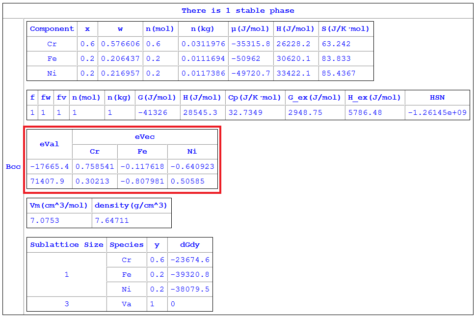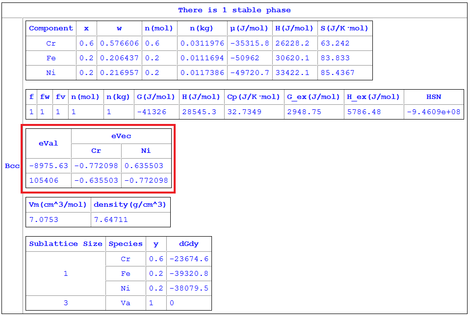 Figure 3.94: Calculated eigenvalues/eigenvectors by choosing “Fe” as the solvent element in Fe-Cr-Ni ternary alloy (from the batch file “Eigenvalues_solvent_Fe.pbfx”)
