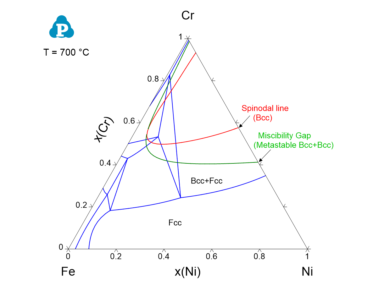 Figure 3.95: Calculated Fe-Cr-Ni isothermal section at 700 °C together with the metastable miscibility and spinodal lines (from the batch file “Spinodal_boundary_on_section.pbfx”)