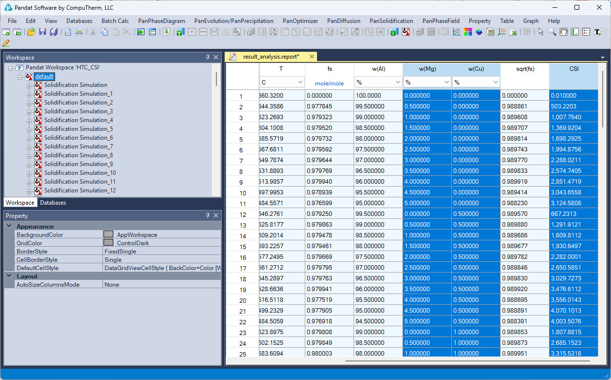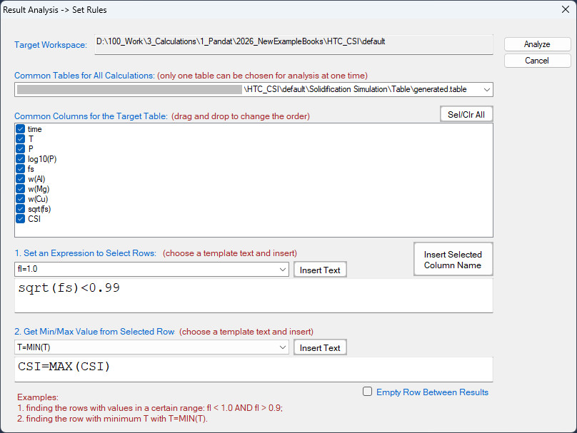 - After results analysis, a table which list CSI = MAX(CSI) for each alloy composition is generated as shown in Figure 5.3.7; Unselect the "Empty Row Between Results" to avoid empty lines between data.