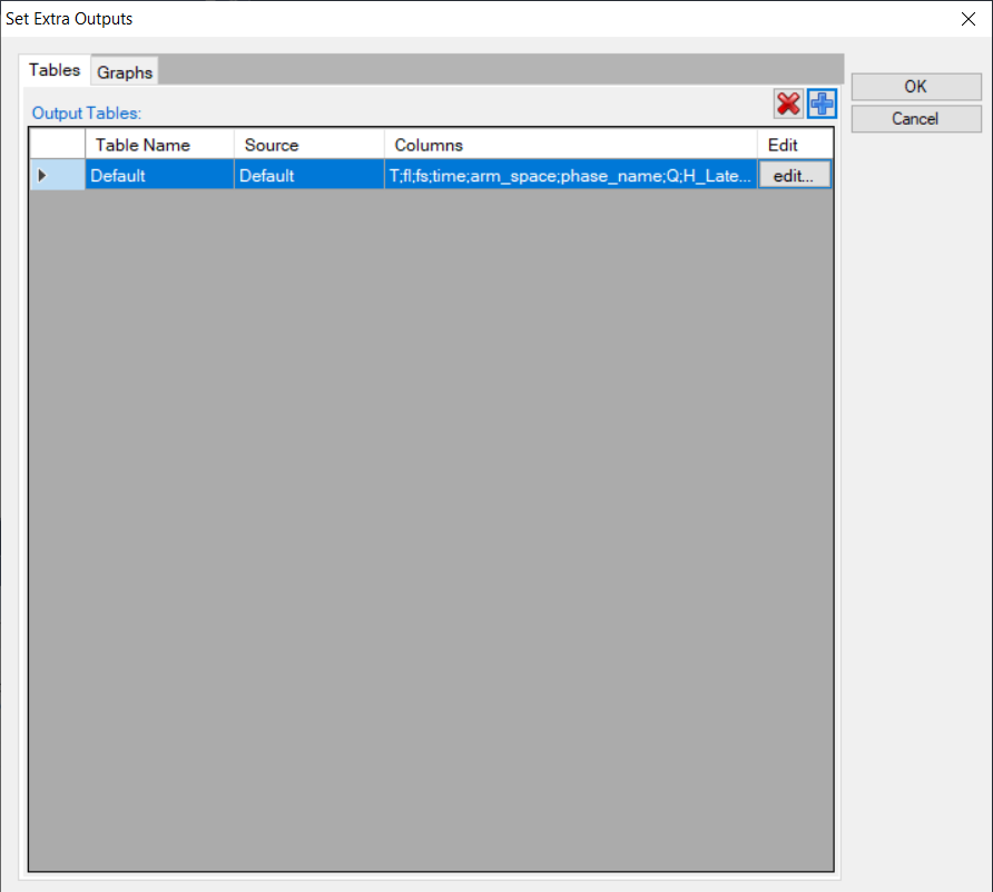 - Set “Extra Outputs table”. Click the “Extra Outputs” in Figure 5.3.2, a new interface as shown in Figure 5.3.3 will appear. Click the blue “+” symbol in Figure 5.3.3 to pop out the Table Editor as shown in Figure 5.3.4. In the Table Editor, users can easily drag and drop properties from the left panel into the Columns area on the right, such as time, temperature (T), and CSI. Users may also manually enter properties, for example sqrt(fs). In Pandat, CSI is defined as -dT/d(fs)1/2. After completing these settings, an additional output table will be generated alongside the Default table;