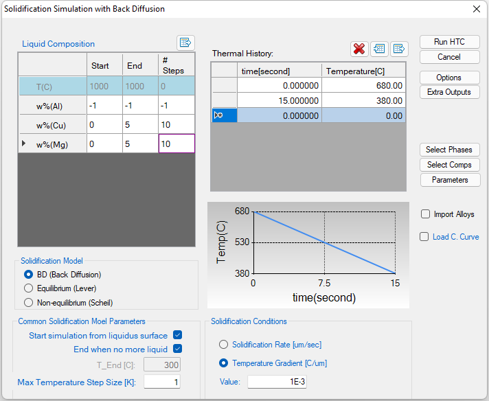 Figure 5.3.2: Dialog to setup compositional space and solidification conditions for HTC