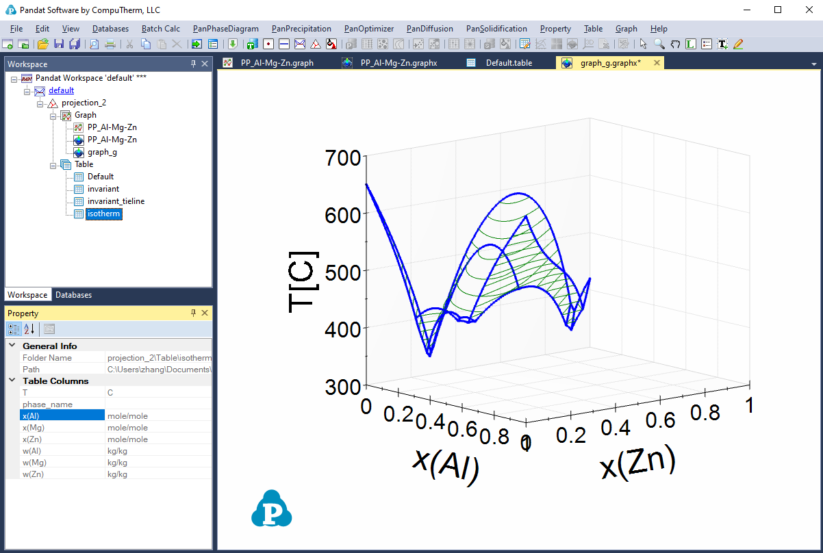 - User can add more plots to the 3D graph. First click on the table containing the data, i.e. isotherm data in Figure 2.26, and the property window will show the column names in this table. Then select the column "x(Al)" as x-axis in the property window, drag and drop it to the graph; then hold the key and select the second column "x(Zn)" as y-axis, drag and drop it to the graph; and then hold the key, select the third column "T", drag and drop it to the graph. The new plot of the data will be added to the original 3D graph shown as Figure 2.27.