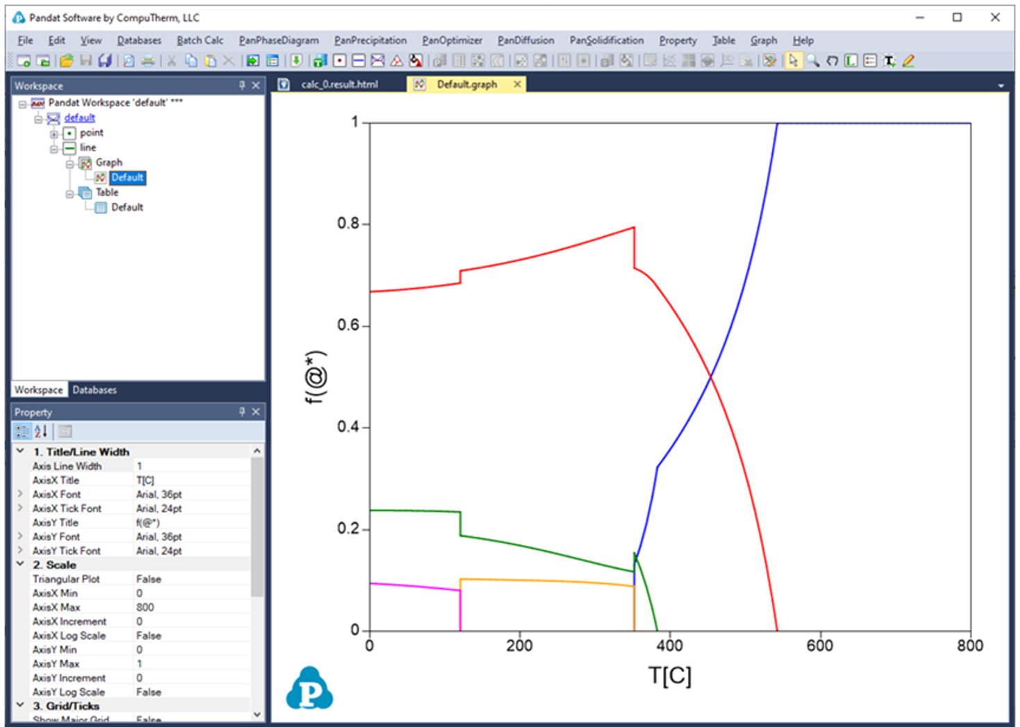The calculated results are stored in both graph and table. The default graph plots the variation of fraction of each phase with respect to temperature, as shown in Figure 3.18 User can modify the graph through the Property window by modifying the title, scale and add legend to get a better view as shown in Figure 3.19 In the Explorer window, user can double click the “Default” under the “Table” tree to view the default table. User can select any columns to create new plots. Furthermore, select the “Table” and right click the mouse, user has the option to Add a New Table to generate new tables and then plot other figures as needed.
