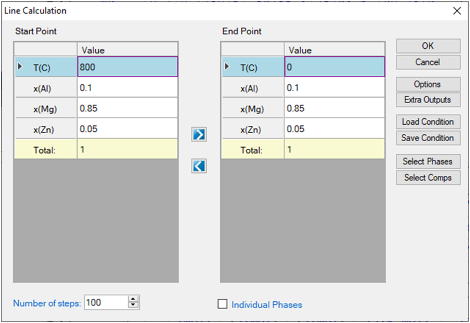 button on the tool bar. The Line Calculation (1D) dialog box allows the user to set the start and end points of the line, and the number of steps to calculate along the line as shown in Figure 3.17. User can also access the Options, Extra Outputs, Load Condition, Save Condition, Select Phases, and Select Comps the same way as those in point calculation. Note that the line calculation set up in Figure 3.17 is along the line of fixing alloy chemistry with varying temperature.