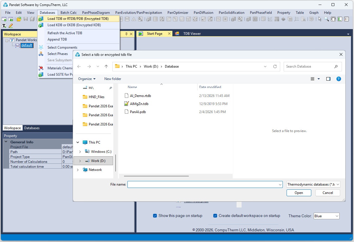 Pandat can load TDB, RTDB, and PDB (encrypted TDB) database files. TDB files are open-source databases. Users can view both the phase models and the parameters for each phase. RTDB files are encrypted TDB files that can be used with the Pandat Education version. Some RTDB files are included in the Pandat Example folder. Users can load and use these databases and view the phase names and models through the TDB Viewer, but the parameter values are not accessible. are encrypted TDB files that can be used with the Pandat Education version. Some RTDB files are included in the Pandat Example folder. Users can load and use these databases and view the phase names and models through the TDB Viewer, but the parameter values are not accessible. PDB files are encrypted commercial databases. A valid license is required to use them. With a proper license, users can view the phase models through the TDB Viewer, but the parameter values remain hidden.