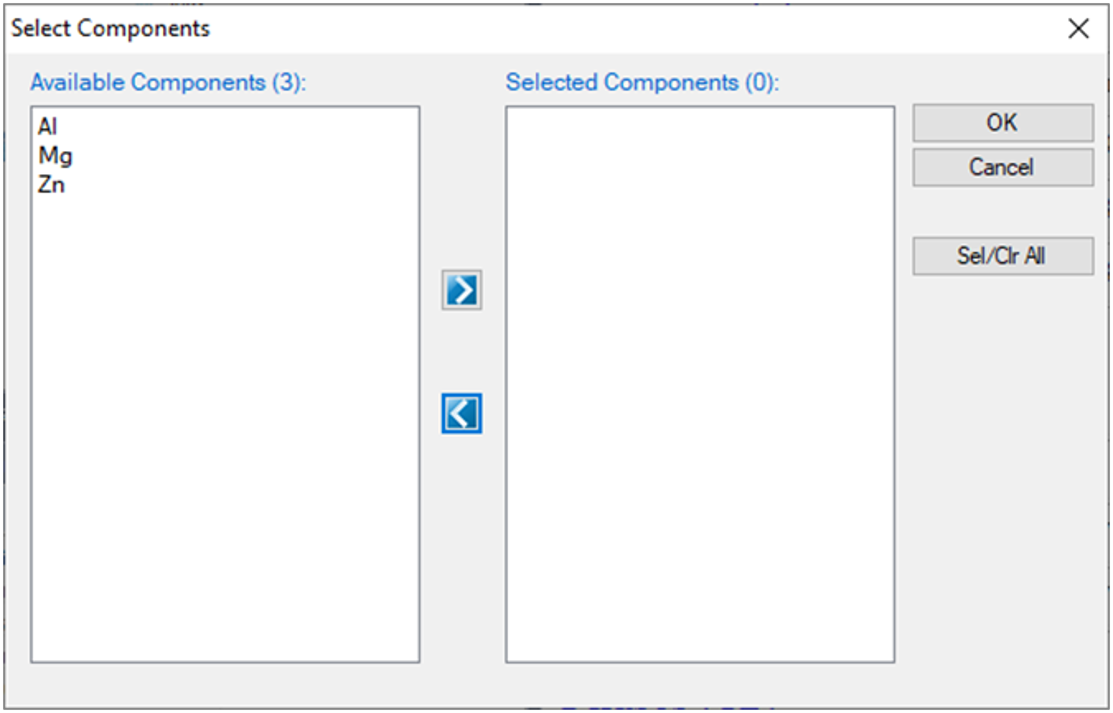When you want to change components during the calculations, or if the database has already loaded in the system, this window does not popup after load the tdb or pdb, click the menu “Databases → Select Components”, this window will popup for component selection.