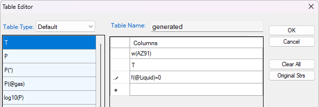 - Add a new Table as shown in Figure 1.29.2 to get the ZPF line data of the liquid phase (f(@Liquid)=0);
