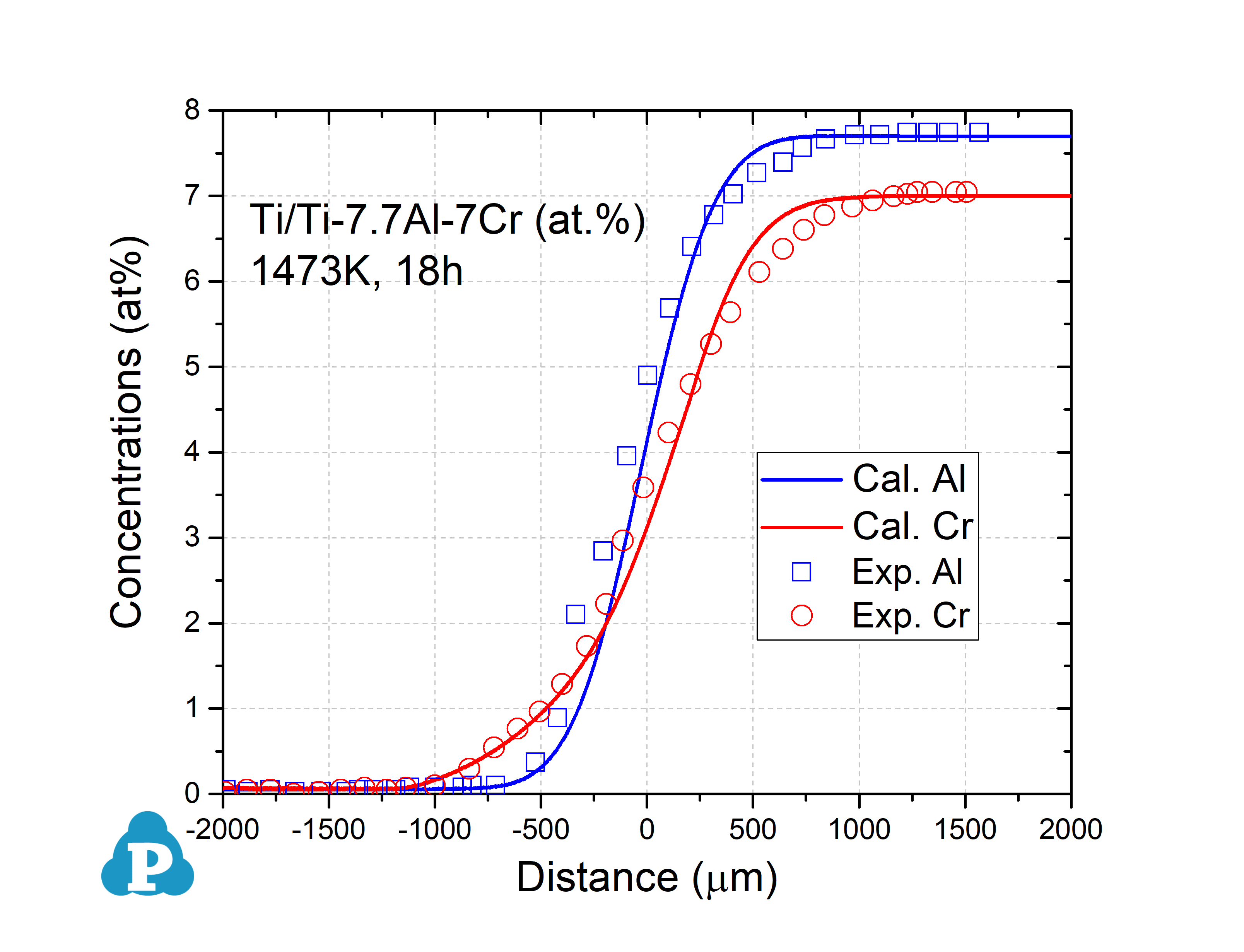 Figure 2.1: Concentration profiles of Ti-5.9Al/Ti-4.8Cr (at.%) at 1473K for 18h [2011Li]