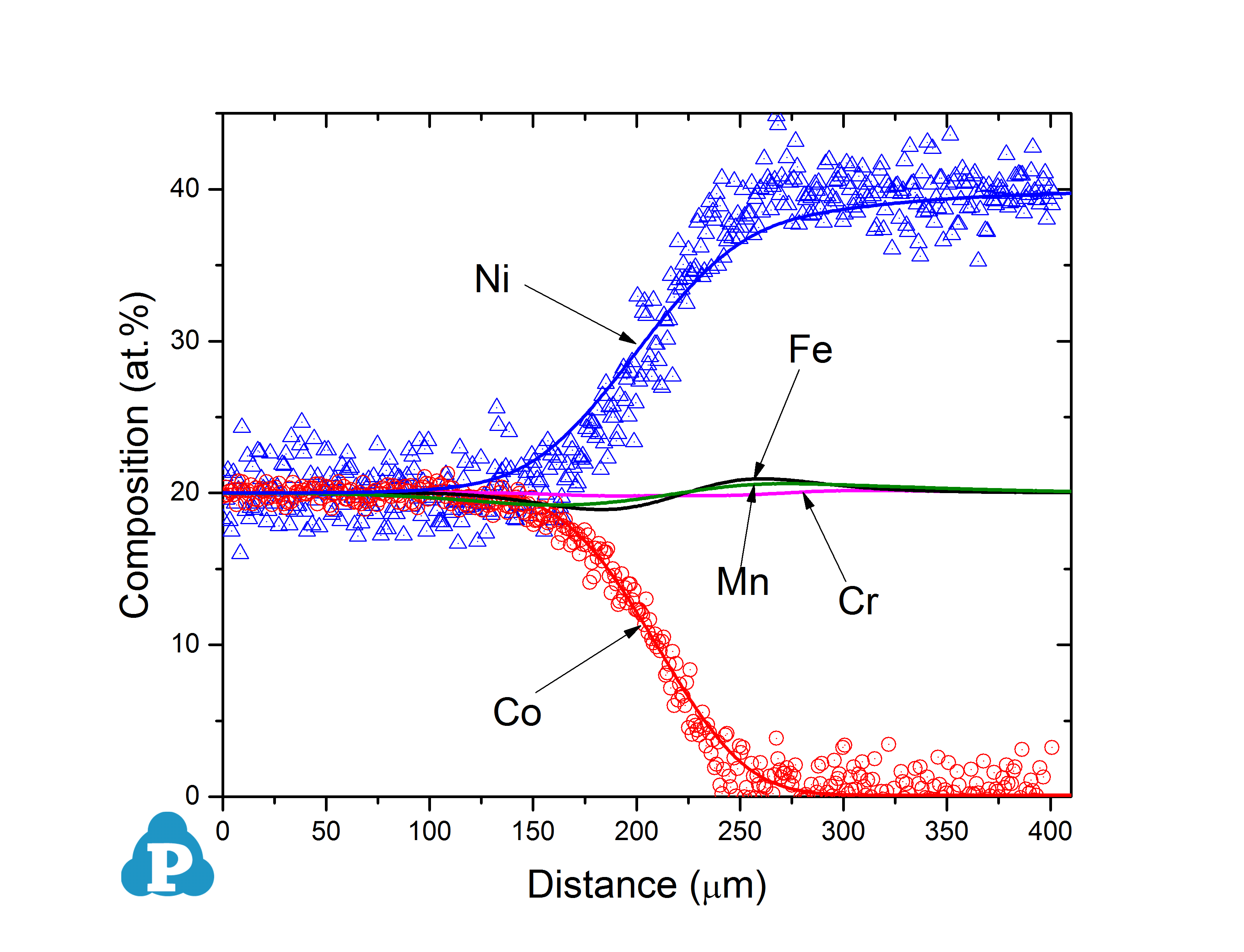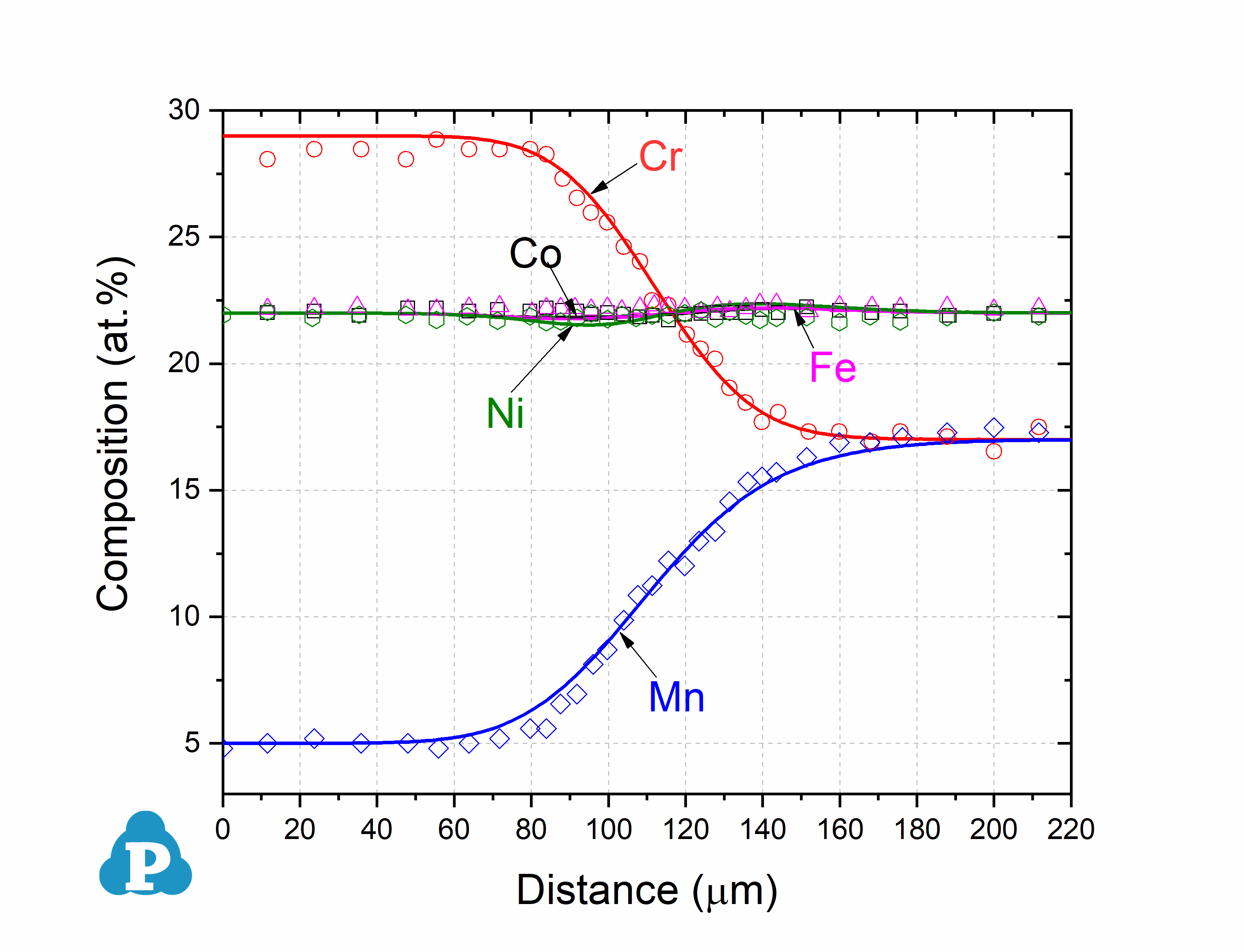Figure 2.1: Simulated concentration profiles of Co-30Cr-20Fe-30Ni/Co-20Cr-30Fe-20Ni (at.%) diffusion couple annealed at 1000 °C for 100h with experimental data (symbols) of ref. [2015Kul]
