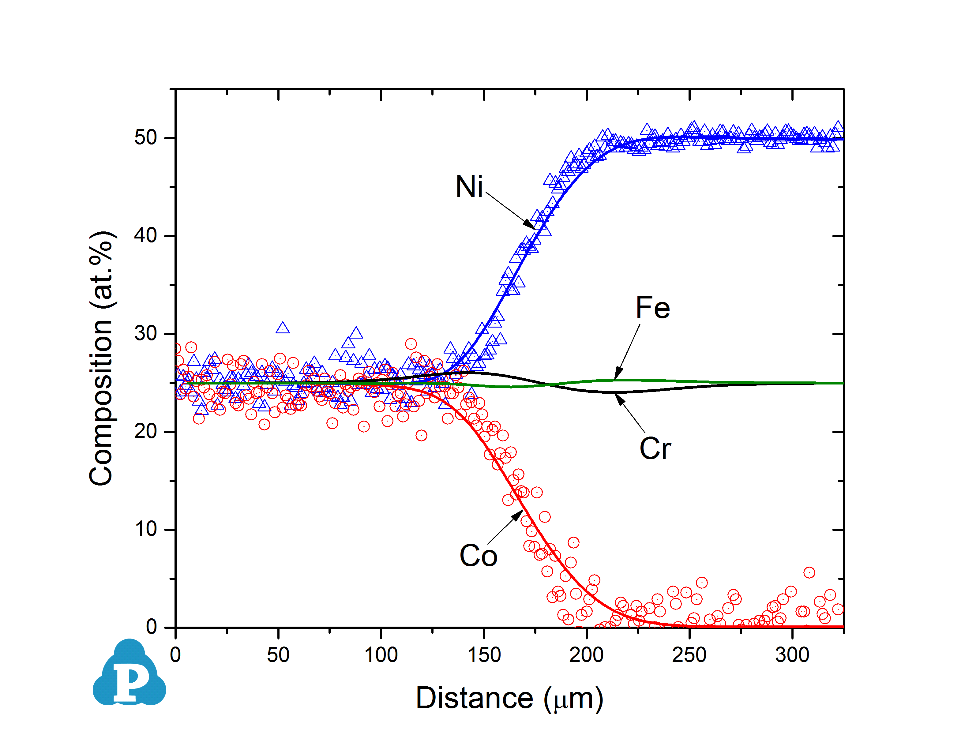 Figure 2.3: Simulated concentration profiles of Co25Cr25Fe25Ni25/Ni50Cr25Fe25 (at.%) diffusion couple annealed at 1120 °C for 48h with experimental data (symbols) of ref. [2017Zha]