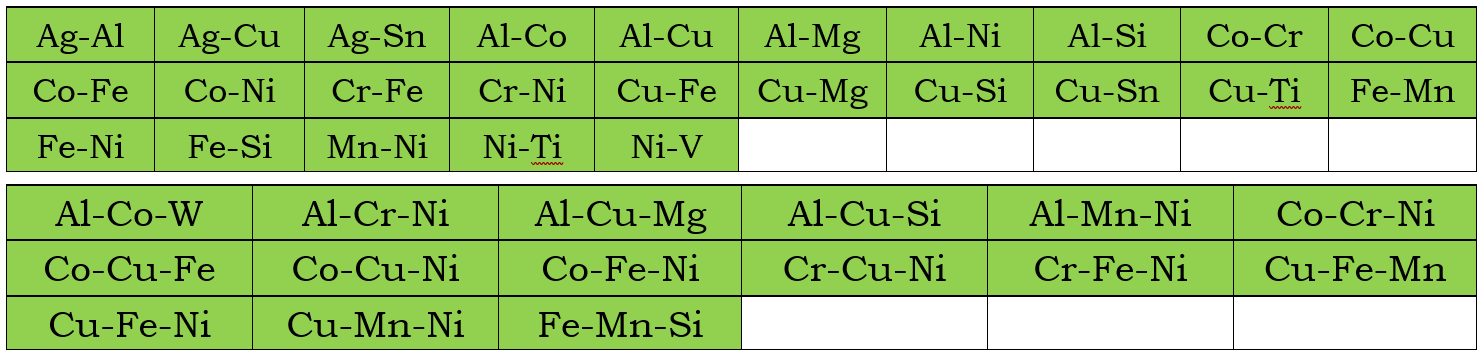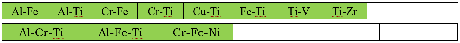 In addition to the assessed self-diffusivities shown above, the impurity diffusion data for all included elements in the current PanHEA_MB database are also assessed. In the following, the assessed chemical-diffusivity within the binary and ternary systems for the Bcc, Fcc, and Hcp phases are listed, respectively.