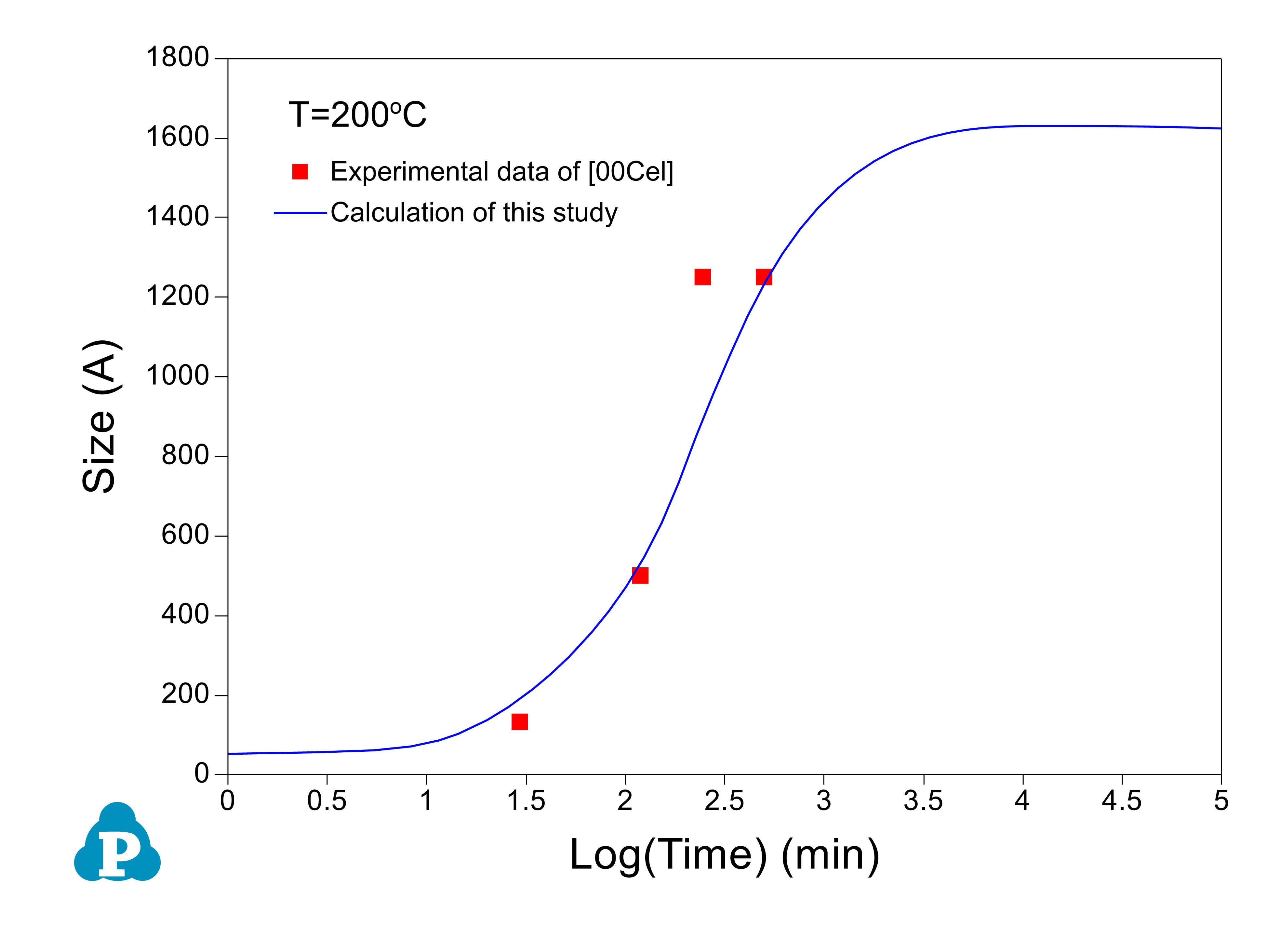 Figure 2.3: Calculated particle size evolution of the γ-Mg17Al12 precipitate aged at 200 °C compared with the experimental data of [2001Cel]